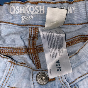 These are OshKosh B'gosh skinny jeans, size 5/5A. The jeans are light blue acid wash denim with brown stitching. They feature a button closure, front and back pockets, and a slim fit. The material composition is 76% cotton, 23% polyester, and 1% elastane. There is adjustable elastic in the waist band for a customized fit.