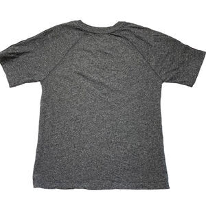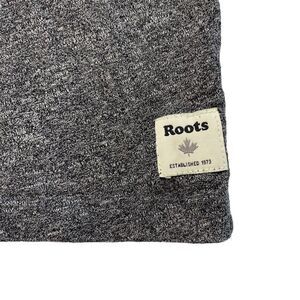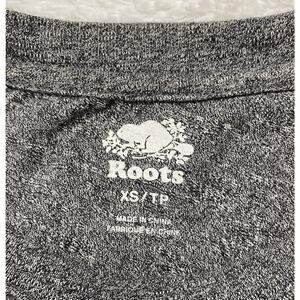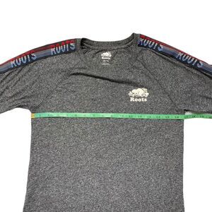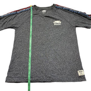 ROOTS Heathered Gray with Shoulder Stripe Logo in Red, White, & Blue Short Sleeve Shirt. Size XS Mens/Unisex. Roots logo flocked on left chest and logo patch at left hem. Fabric tag has been removed -- feels like a cotton or cotton blend knit. Excellent condition -- no rips, stains, or holes.