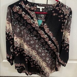 Stylish rust colored blouse with white polka dots. Features a flattering neckline and long sleeves. NWT, size XL