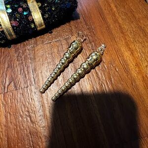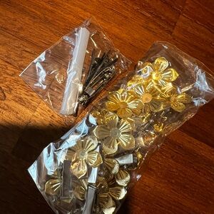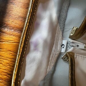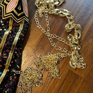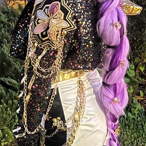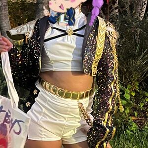 Stylish white top paired with a black sequin embellished jacket and pants. Features gold and multicolor accents. Used once Rumi costume. It is a size small however runs smaller. I would say probably size xxs. It was my daughters she wears a size 12 in children. The jacket is a beautiful sequin that catches light beautifully. The top had a bit of purple stain from the hair dye I put in my daughter’s hair. The hair clips are included which have not been used. I purchased separate hair clips. Earrings are also included. They are clip on earrings that we did not use. Boots are not included those were purchased separate. My kid received lots of compliments. I can take more pictures of the costume just send me a message.