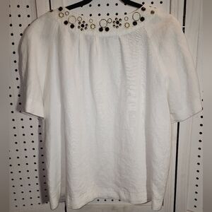 JM Collection Size 14 Linen Embellished Open Front White Short Sleeve