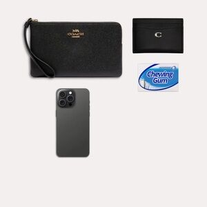 Elegant peppled black leather large wristlet by Coach. Features a striking gold logo detail. In original packaging from Coach.