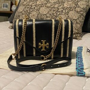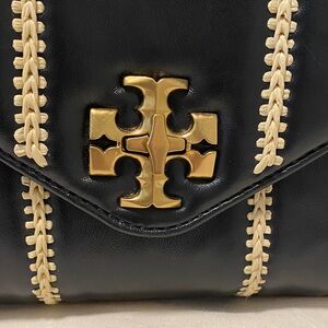 Chic black satchel with cream stitching. Gold chain strap and Tory Burch emblem.