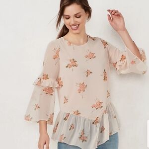 LC Lauren Conrad pink floral blouse. Ruffle hem and sleeves, crewneck, 3/4 length sleeves, super flowy chiffon construction.