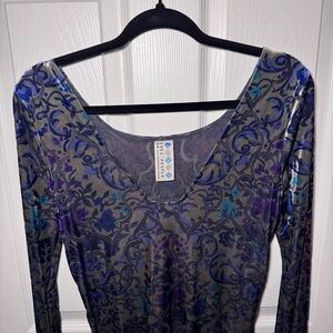 Burnout velvet long sleeve mini dress from Free People. Gray background with blue and purple detailing. Rounded v-neck. Stretchy.