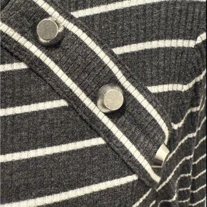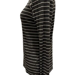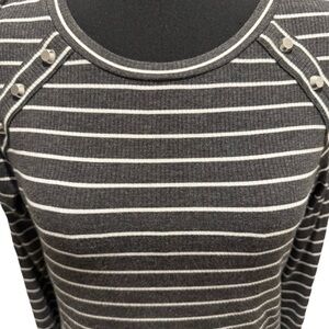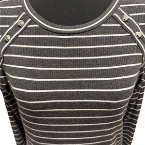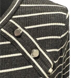This Michael Kors Women’s Long Sleeve Gray & White Striped Pullover Sweater in size Large is a stylish and comfortable addition to any woman's wardrobe. Made from soft viscose knit fabric, this sweater features a classic striped pattern in gray and white and silver tone accents for a casual occasion in fall or winter. With a pullover style and long sleeves, it is easy to care for with machine washable instructions. The Michael Kors brand ensures a high-quality and fashionable piece that can be a versatile and timeless addition to your closet. Length 25 in., Pit-Pit 19 in.