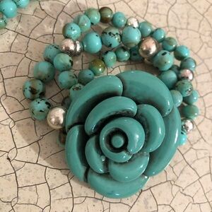 Elegant blue turquoise beaded necklace & bracelet featuring a rose pendant. Perfect for adding a pop of color.