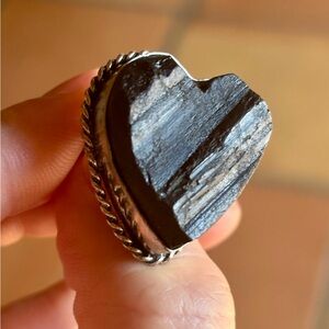 Beautiful handcrafted black tourmaline ring set in solid 925 sterling silver. The stone is carved into a heart shape, showcasing natural striations typical of tourmaline. Black tourmaline is prized for its grounding and protective energy, believed to shield against negative influences and electromagnetic stress.