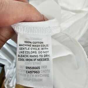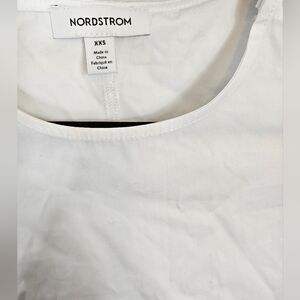 NWT XXS Nordstrom belted white midi dress with pockets and elbow length sleeves in white white. A drapey tie defines the waist of this crisp Poplin frock that's framed with decadent put sleeves. Jewel neckline. Three-quarter length sleeves. 100% Cotton.