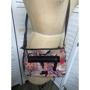 White and yellow striped. Blue embroidered flowers in the chest. Round neck. Zipper all the way down the front. Short sleeves. One pocket in the front.
