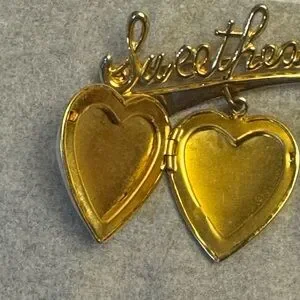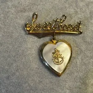 1950’s NAVY yellow gold toned sweetheart locket brooch pen with white pearl-like detail on the heart with a gold tone Navy like anchor and USA in gold tone on the heart. The locket is meant to hold 2 small pictures.
