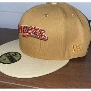 Men's New Era Kahki Milwaukee Brewers 50th Anniversary Side Patch 59FIFTY Fitted. Condition is New. Shipped with USPS Priority Mail.