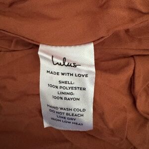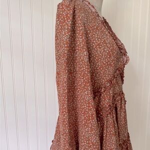 LULUS Admire You Floral Tiered Ruffle Long Sleeve, zips on the side. Polyester, lining: 100% rayon. The color is orange but looks more like a brownish orange.