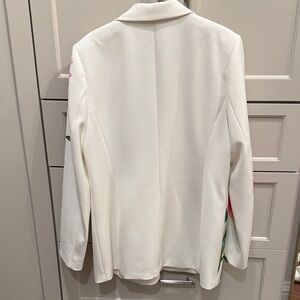 Chic white blazer with vibrant floral patterns. Features pink, yellow, and green accents. Perfect for a stylish look.