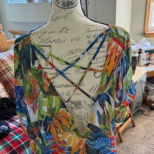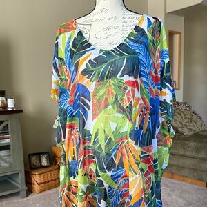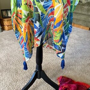 Brighten your beach day with this vibrant swim coverup featuring a stunning leaf print. Perfect for a stylish and comfortable look by the pool or on the sand. Strappy beautiful back. Side splits with tassels.