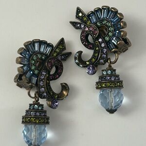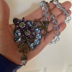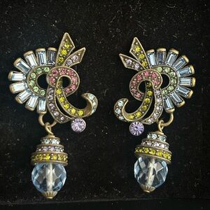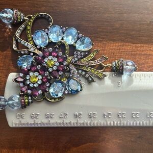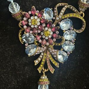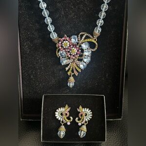 A beautiful matching set by Heidi Daus. This spectacular necklace with matching clip on earrings have light blue faceted beads and pink, blue, green, and lavender colored Swarovski rhinestones set in a swirled art deco pattern.