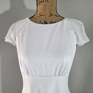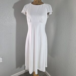 Chic white midi dress with cap sleeves. Flattering silhouette for versatile wear.
