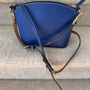 Great Dooney & Bourke stylish crossbody with a rich blue hue. Features a front zip pocket and adjustable strap. Gold-tone hardware adds elegance. Only used a handful of times, in great used condition.