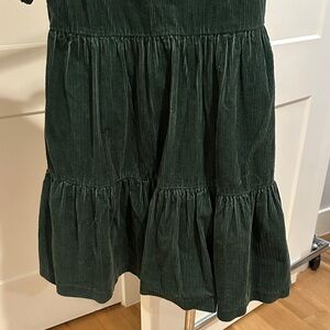 Chic green tiered corduroy dress featuring puff sleeves and a square neckline. Perfect for Thanksgiving or Christmas season.