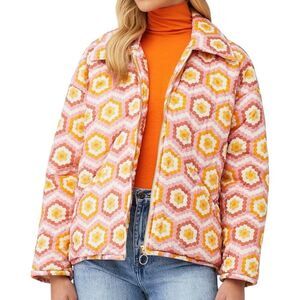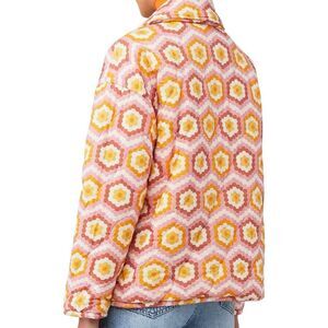 Keywords: puffer jacket, women's jacket, multicolor, geometric pattern, fall fashion, winter wear, casual jacket, mid-length, Show Me Your Mumu, size L, pre-owned, durable fabric, stylish outerwear, cozy jacket, weekend wear.