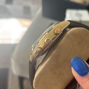 Stylish Emporio Armani chronograph watch with a gold case and brown leather strap. Come with original strap as well.