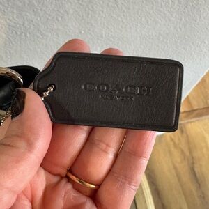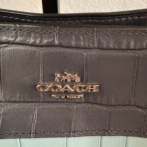 Stylish Coach shoulder bag with a black and teal croc-embossed design. Perfect for adding a touch of elegance to any outfit.