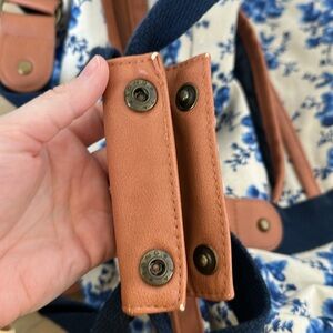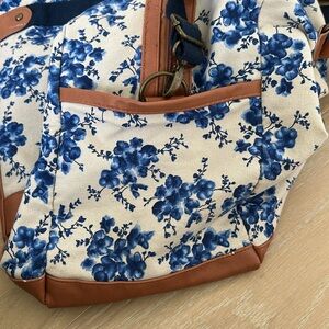 Features: Large overnight bag, grannycore cottagecore blue and white ditsy floral print, light brown faux leather accents, one internal zipper pocket and two other small pockets, three outer pockets, flexible canvas (can fit a ton!), large shoulder/crossbody strap that is removable