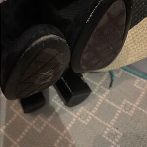 Elegant over the knee boots with iconic CHANEL logo. Sleek black design for a timeless look. Size 38.5 fitting more like 38 they are definetly a more narrow foot shoe- the suede and cc is perfection but the bottom of the heels have wear and the inner heel could use one trip to the shoe maker but any good one would fix right not for much $ amd these boots now would be 2k plus