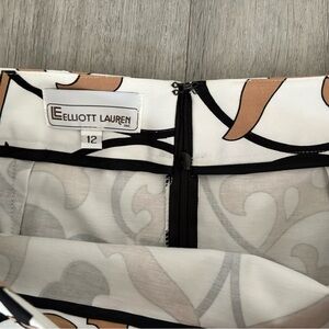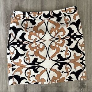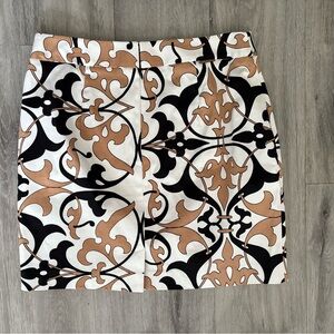 Elegant pencil skirt with intricate black and brown pattern. Ideal for sophisticated looks.