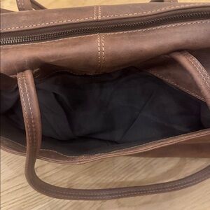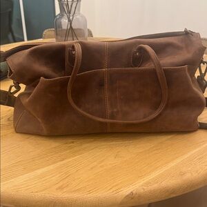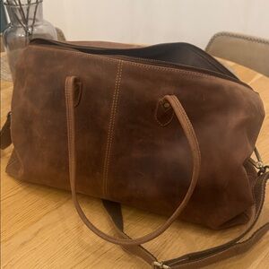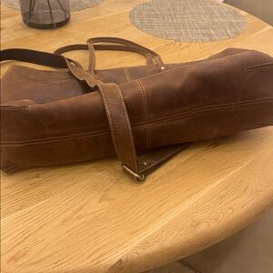 Stylish brown leather tote bag with dual handles and a shoulder strap. Perfect for everyday use.or overnight bag. Has several compartments on the inside two with zippers and four that are open and a magnetic pocket on the outside.