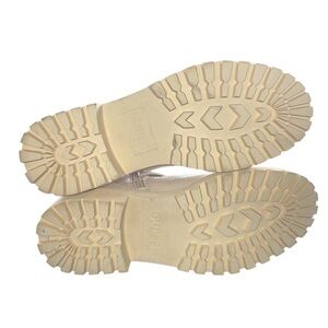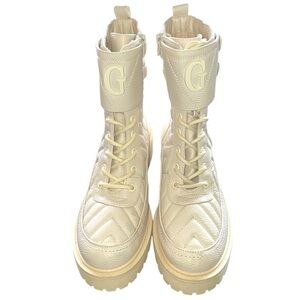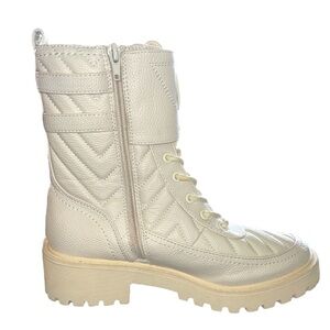 Faux-leather hiker boots, creamy off white Quilted design with debossed logo text, Round toe, Ankle height, Rubber lug sole, Lace-up closure, 1.5" heel. Brand new never worn. No box.