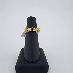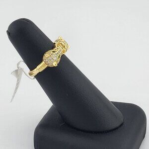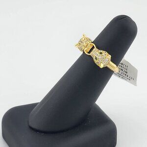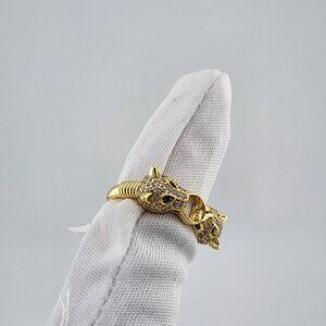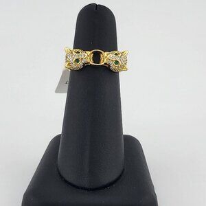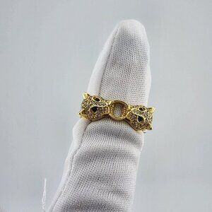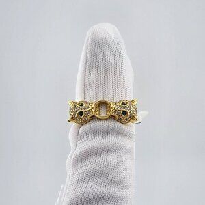 Each panther is adorned with shimmering cubic zirconia stones, adding a sleek, high-end sparkle to the overall look. The piercing green cubic zirconia eyes bring a lifelike intensity and bold energy to the piece, making it perfect for those who embrace fearless fashion and standout accessories.This ring is brand new with tags and comes with a free jewelry bag, making it ideal as a gift or a strong addition to your personal collection.