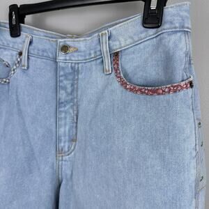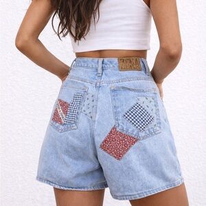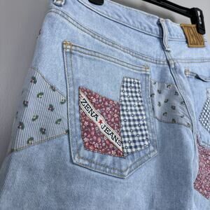Listed is a vintage Zena Jeans mom jean style jean shorts, with patchwork detailing, leather name patch on waistband. Button and zipper closure. Size 14, please note vintage will fit smaller. Please be sure to see all photos and measurements. 100% cotton.