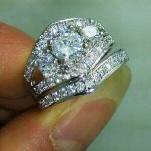 2 pcs 925 Sterling Silver Plated Retro Carved Luxury Fashion Ring Set, UNVN12133