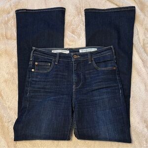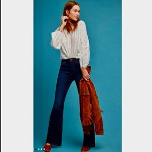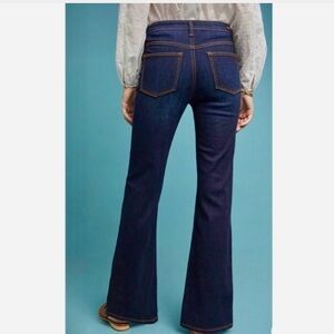 Pilcro by Anthropologie: High-Rise, Bootcut Jeans: Dark Denim in Color. Buttons outside Leg hems. In Like new condition: no stains, no holes, and from a smoke-free home. No flaws noted. see pics for details. Size is Women’s 27. Inseam measurements are 30.5”. Thanks!