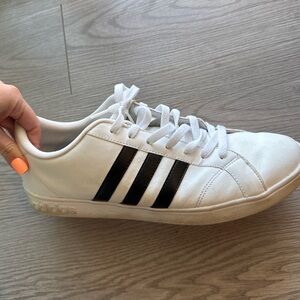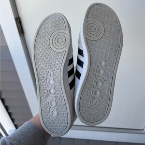 Classic Adidas Neo sneakers in white with black stripes and the signature Cloudfoam comfort footbed for all-day cushioning. Timeless low-top style that pairs perfectly with jeans, joggers, or casual outfits. Gently used with minor creasing and light wear on the uppers — soles are in excellent condition (see photos). Clean, comfortable, and ready to wear!