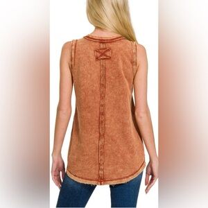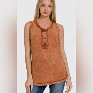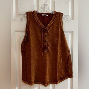 Zenana/women’s NWOT sleeveless rust color tank top with button accents. Ideal for everyday wear. Size S, PTP 20”, top length 27”.