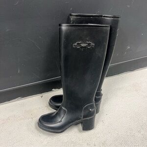 Salvatore Ferragamo Clarissa knee-high rubber boots with tonal stitching throughout, tonal logo accents at openings and stacked soles. Size 6. Comes with dust bag