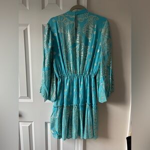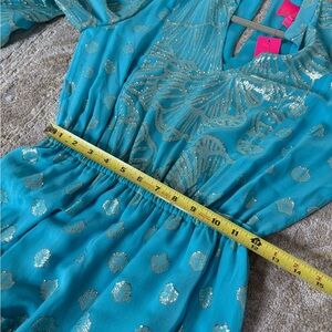 Chic new with tags turquoise dress with silver accents by Lilly Pulitzer. Long sleeves and flowing tiered design. Elastic waist. The color is called Bermuda Blue.