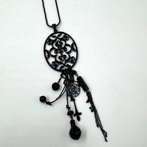 This enchanting necklace combines vintage charm with gothic elegance. Its intricate filigree pendant captivates, while the dangling beads and chains add whimsy, making each wear a story.