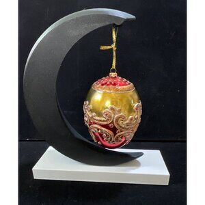 ESTATE FIND. WELL PRESERVED ITEM. This decorative ornament set features captivating gold and red hues with intricate embossed designs. 5.5”