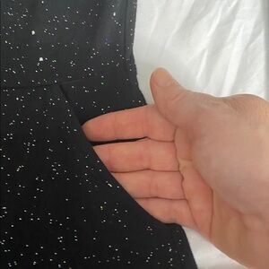 Charming black dress with glitter accents and pockets. Ideal for formal events. Comfortable and stylish.