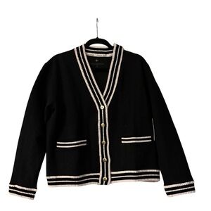 Chic striped cardigan by LOFT. Features dark blue and cream stripes. Button-up front with ribbed texture. Ideal for layering. Pic 5 is p2p measurement and pic 6 is length.