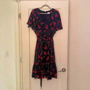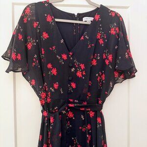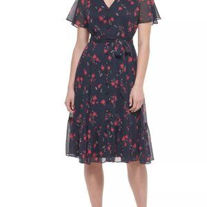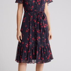 Calvin Klein chiffon midi dress featuring a navy base with reddish-orange floral print. Designed with a V-neckline, front button detail, flutter sleeves, and a tie waist for a flattering fit. Lightweight and flowy with a tiered hem.