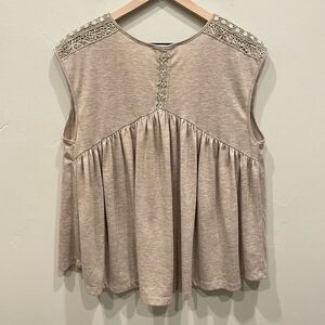 Miss Me Women’s Heathered Knit V-Neck Top Top is in excellent used condition No visible rips, stains, or pilled spots Size: XS Color: Taupe Beige Flowy front cinch tie top Shoulder and back crochet applique details 65% Polyester, 35% Cotton. Hand wash cold STYLE MT0925S Measurements (laid flat across): Pit to Pit: 20.75" Shoulder to Shoulder: 18.75" Total Length: 25.75"