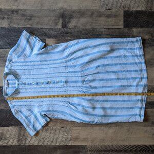 This is a Faherty Gemina Shift Mini Dress in the color Ocean Catalina Stripe. It is in excellent pre-owned condition. It is a size XS, and the last three images have measurements. Pintuck seams shape the front and back of this short-sleeve shift. Front button closure, banded collar, short cuffed sleeves, on-seam pockets, 100% linen. Style# WDU2126