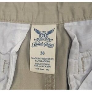 * These Faded Glory men's cargo shorts in size 38 are perfect for casual outdoor wear. Made from 100% cotton, they offer comfort and durability. Featuring multiple pockets, they're ideal for daily use. Note a small flaw near the pocket, as shown in the photos.