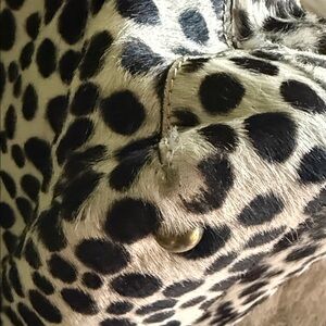 Boden Haircalf Animal Print Tote Bag, Chic and timeless Boden tote featuring genuine haircalf with a bold black-and-cream spotted pattern, black leather handles, and brass-tone hardware, snap top, Spacious interior — perfect for everyday use or travel, gently used, minor wear corners * inspect all pictures and video