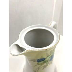 Antique hand painted coffee/tea pot from Japan. Nice artistry floral of blue/purple and pink flowers with gold accepts on handle, lid and rim. Measures 5.5 inches at base, 7 inches wide with handle, 7.5 inches tall without the lid, 9 inches tall with the lid, lid is 3 inches in diameter. Piece it beautiful but has one small chip less than 1 mm near bottom which is detailed in close up picture. It is very delicate. See pictures for accurate depiction of its condition. No chips or crazing or cracks other than the one small mentioned.