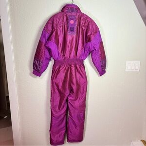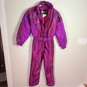 Step into bold retro style with this vintage 1980s Kaelin Solar ski suit, made in Hong Kong. A stunning metallic magenta-purple one-piece with high-quality insulation, geometric stitching, and that iconic Solar Energy Power back patch.